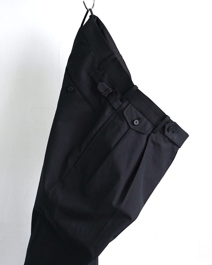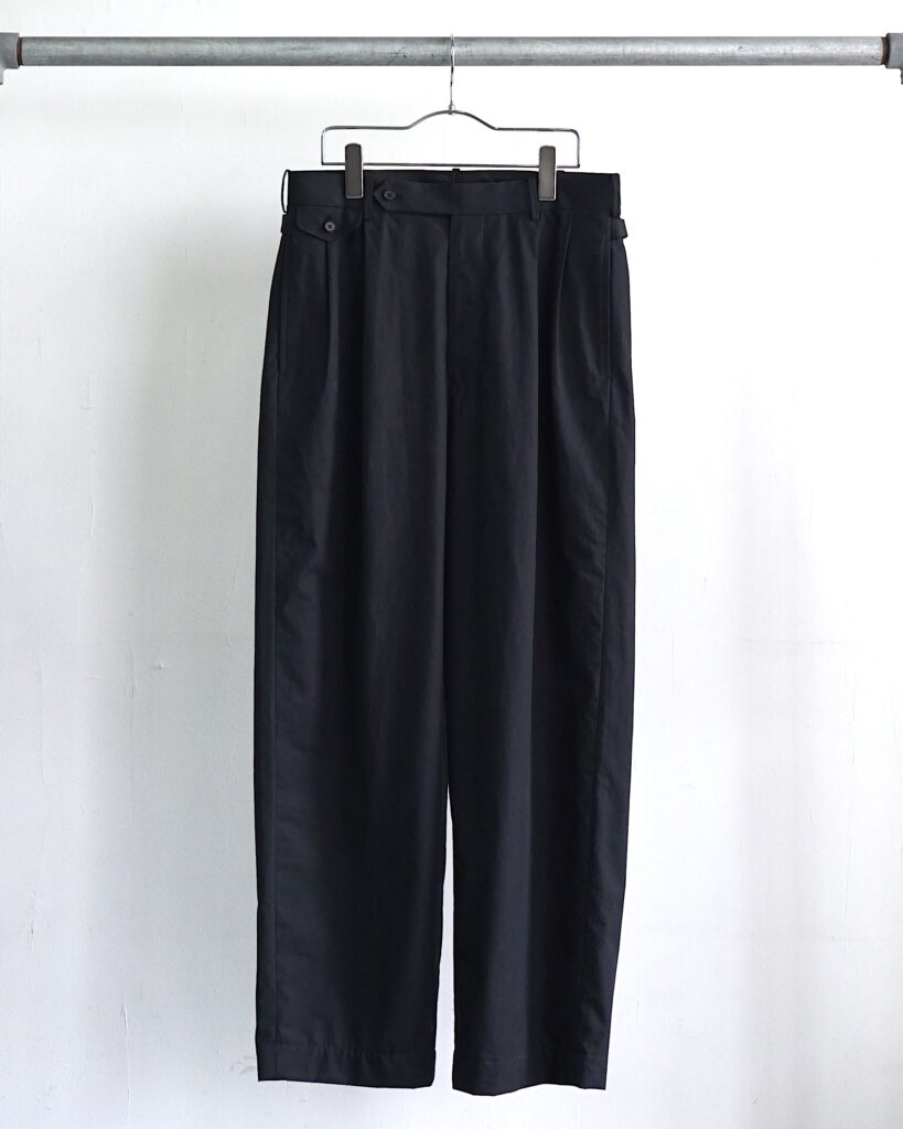 シルクコットン混紡糸を高密度に織り上げたウェザークロス素材を使用した、アメリカ製の2プリーツトラウザーをベースにしたパンツ。