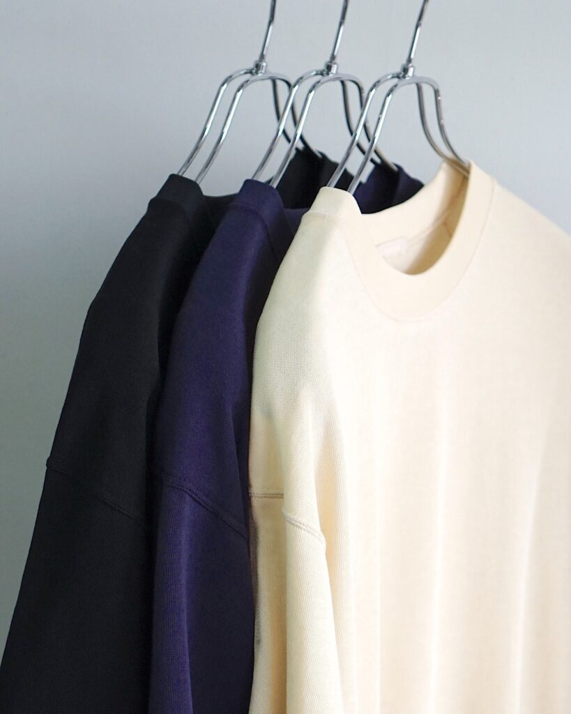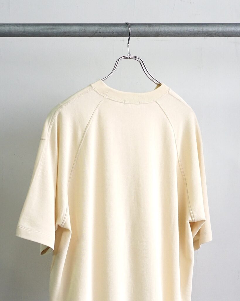 前後で違いのある変則的な袖付けが特徴的なスウェットシャツをTシャツ仕様に落とし込んだアイテム。