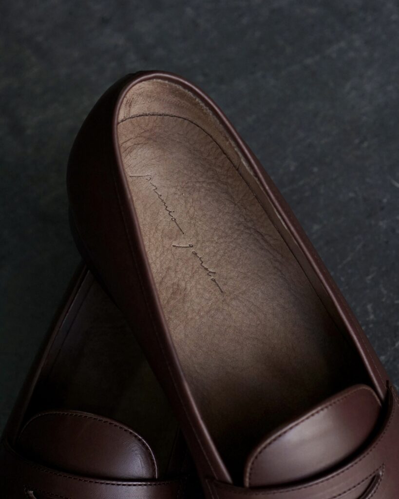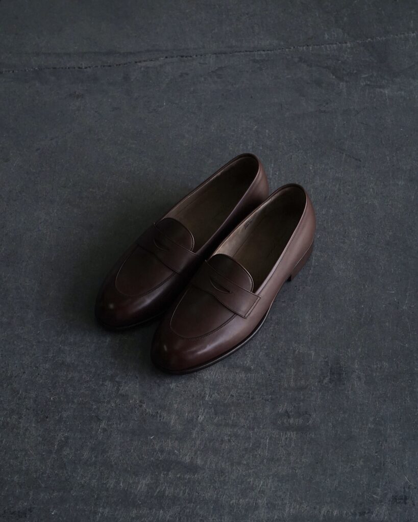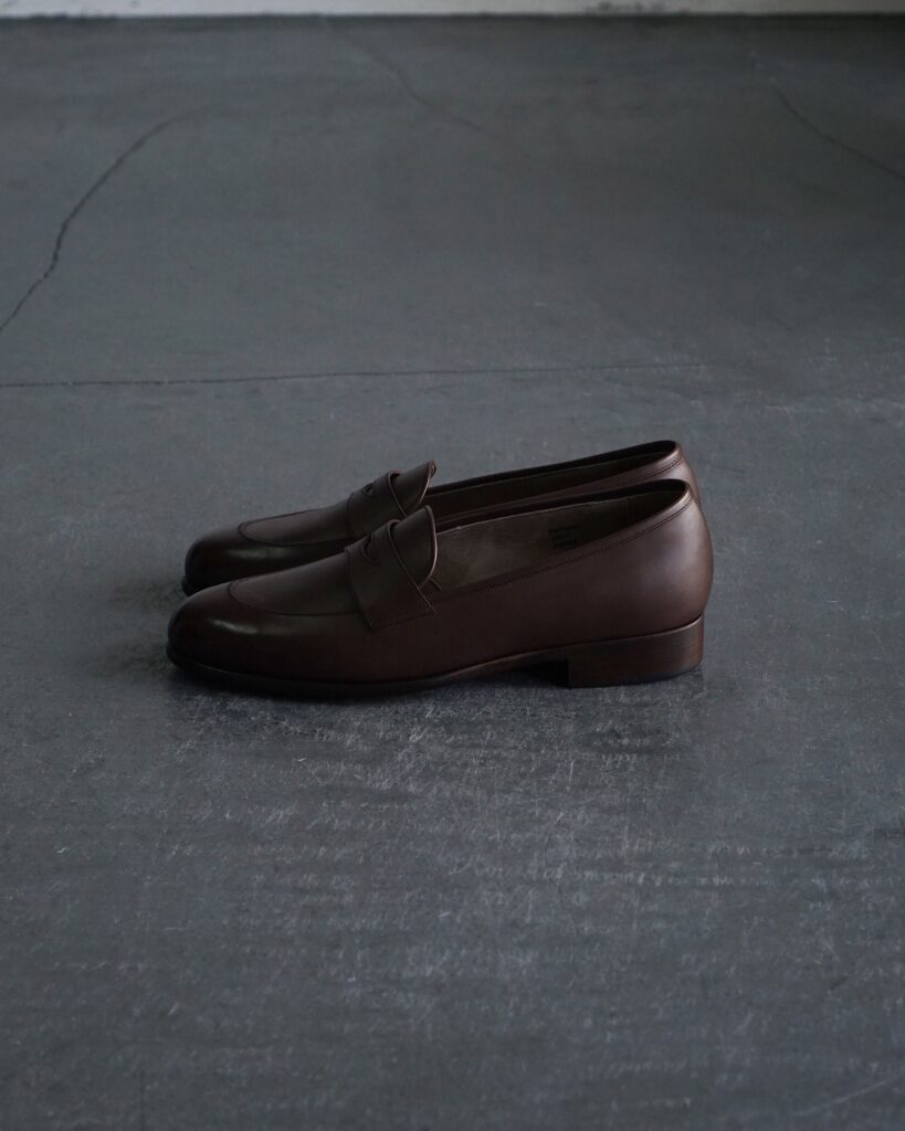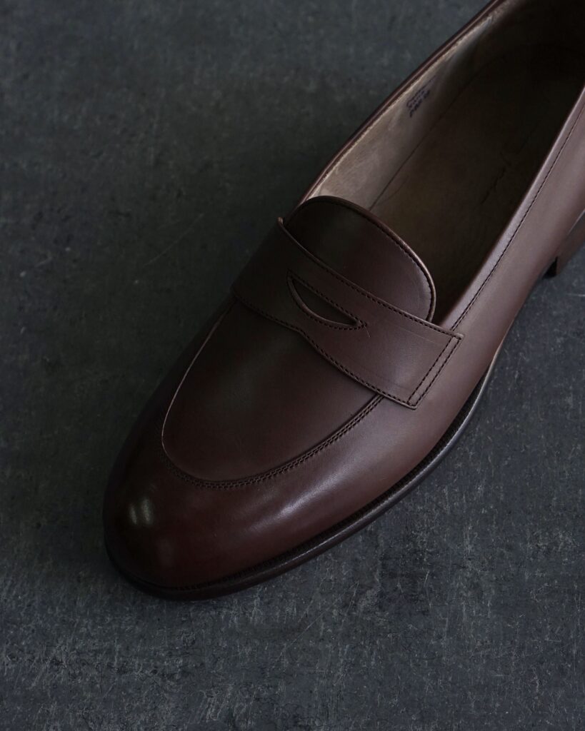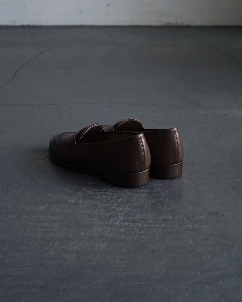 一般的なモカシン縫いを用いたローファーとは違い、落としモカを用いることですっきりとした印象に。