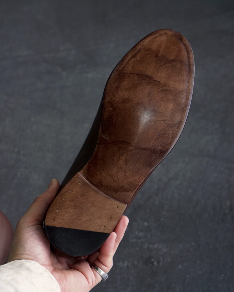 さらにトゥのポリッシュ仕上げや、ライニングのヌバックの落ち着いた色味、靴底のヒドゥンチャネル仕上げ(糸目を隠す技法)などの視覚的な美しさも魅力。