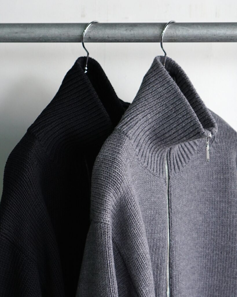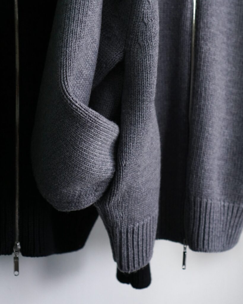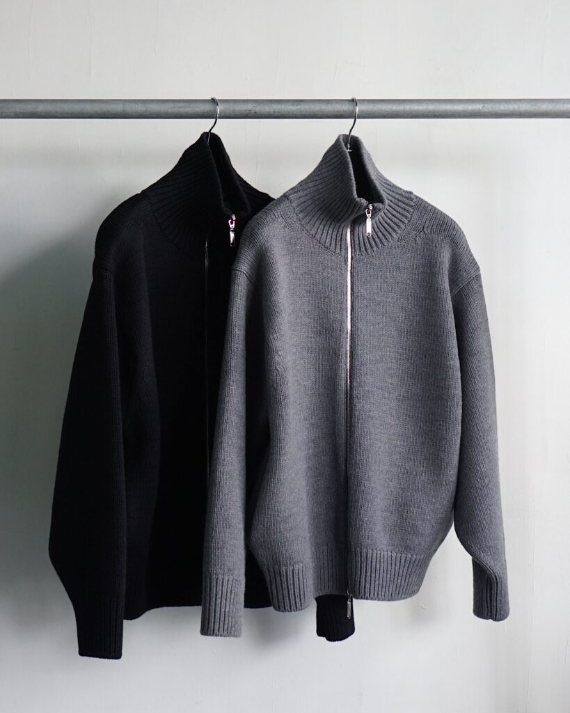 本来ハイゲージのニットで使用される極細梳毛ウールを超多本取りしてローゲージで編み立てた重量1キロ越えのドライバーズニット。
