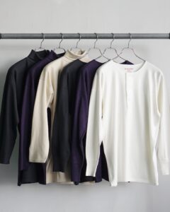 特殊な洗い加工による、自然な膨らみと落ち感、先染めの糸を使用した深い色味が特徴。