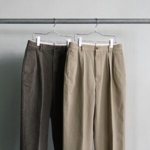 タテ糸に細番手のフィンクスコットン、ヨコ糸にベルギー産のリネンを使用し、高密度に織り上げたウェザー素材を使用したフィールドパンツ。