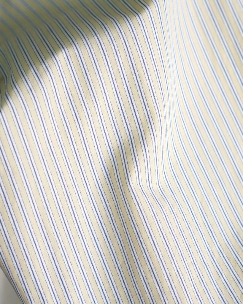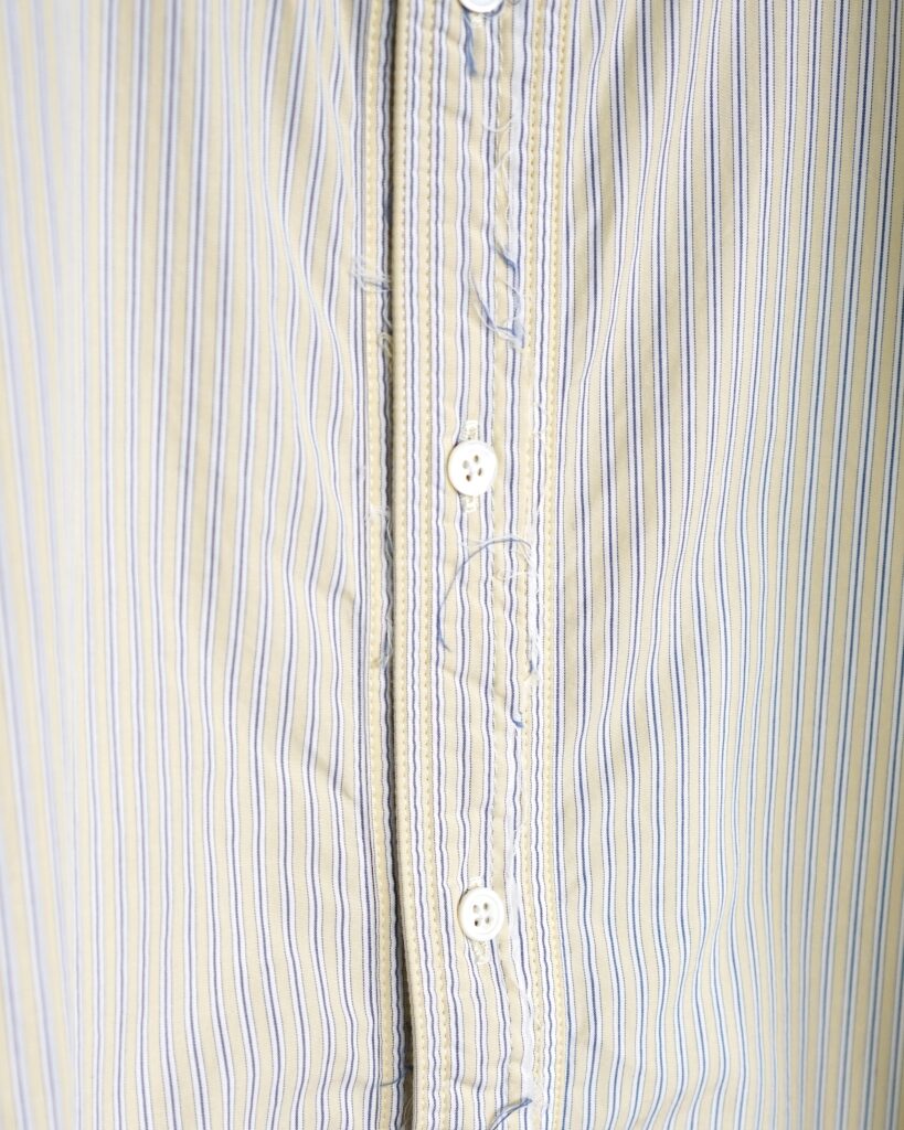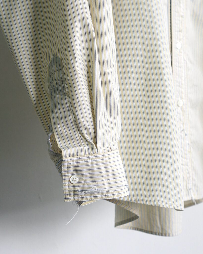芯地を一切使用せず、共布を芯地としてして使用して、さらに一番上の層の生地をカットオフし、芯地替わりに使っている表地を覗かせたシャツ。