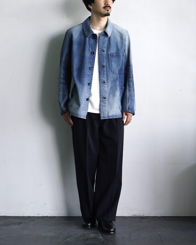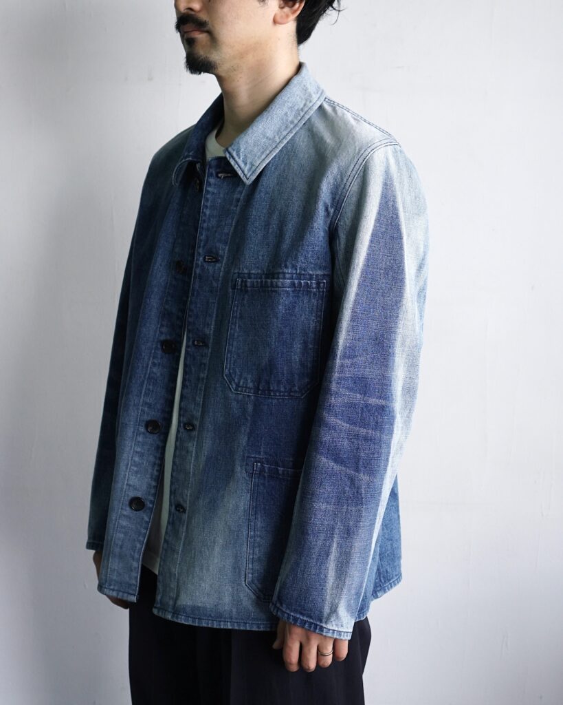 窓際に掛けっぱなしにして片側だけ日焼けしたような独特の加工感と、レギュラーフィットなサイズ感も新鮮なカバーオール。