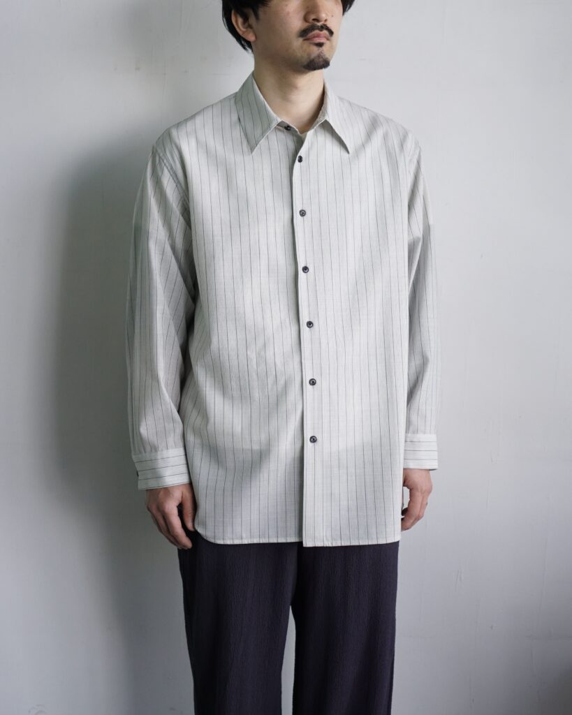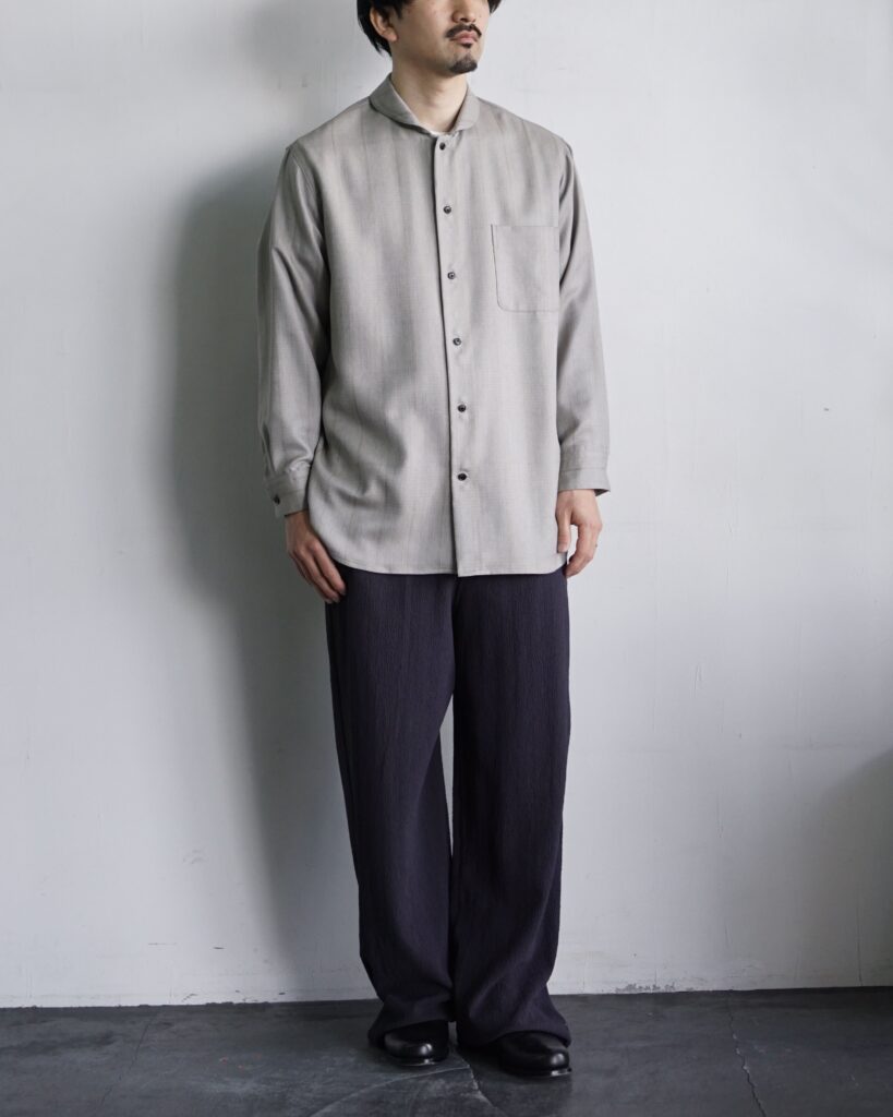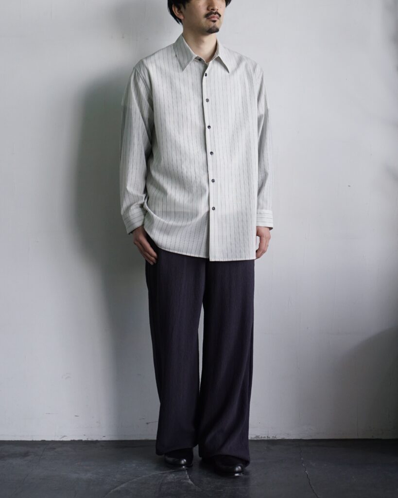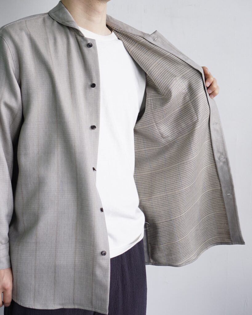 一見控えめな印象の中に、実験性と色気を秘めたシャツ。 ぜひ袖を通して、その陰影の美しさを体感していただければと思います。
