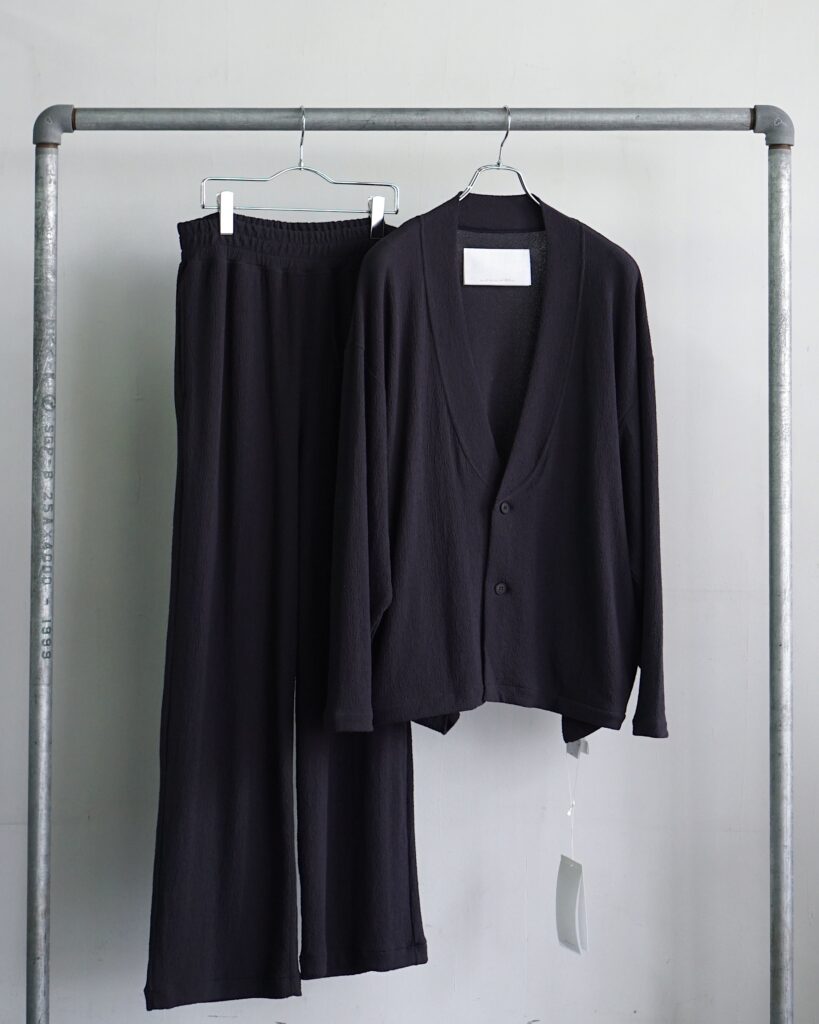 特徴は、削ぎ落とされた襟元のライン。 ごく細いショールカラーが、開けても閉じても美しいバランスで収まるように設計され、nonnotteらしいリラックス感の中に凛とした佇まいを感じさせます。