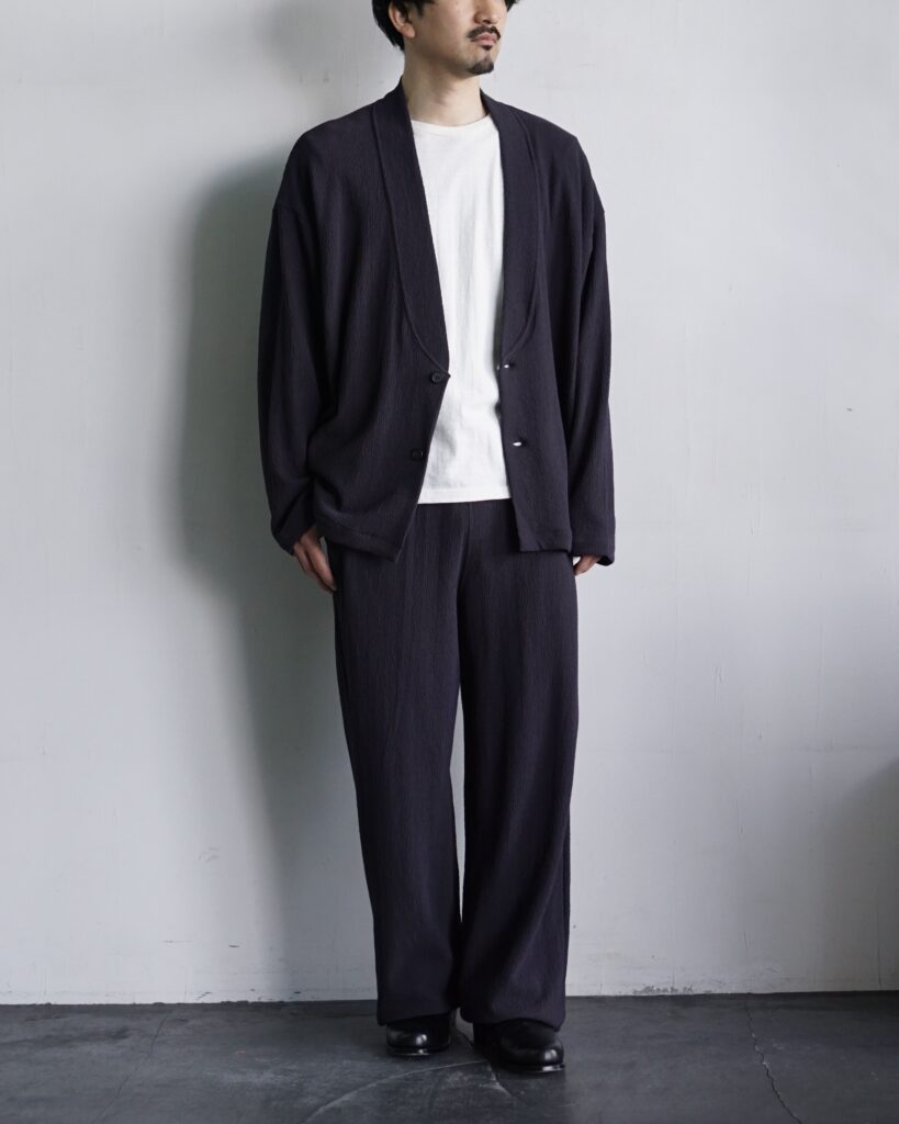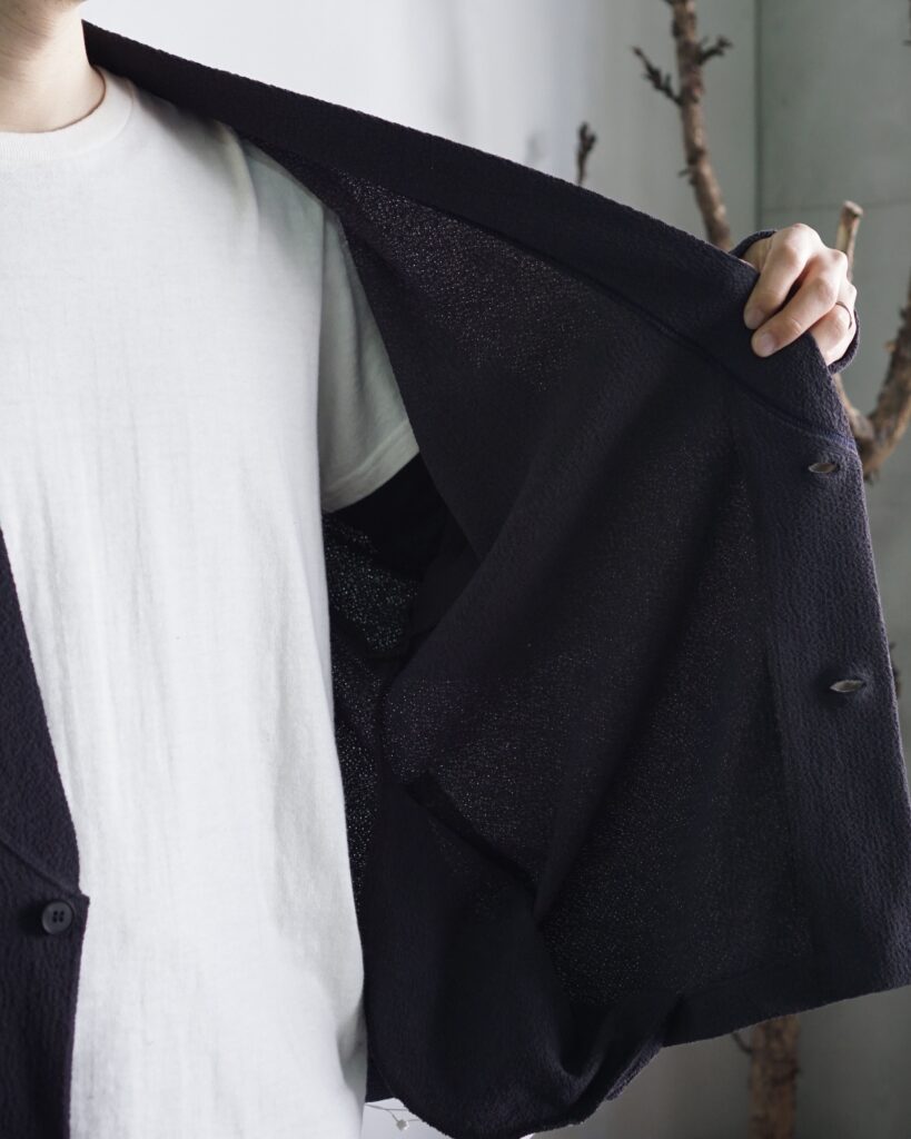 一般的なショールカラーではなく、あえてシャープな襟にしたのは、この素材の迫力を活かすため。 肩の力を抜いて羽織れるのに、どこか背筋が伸びる。 そんなバランスを求めました。