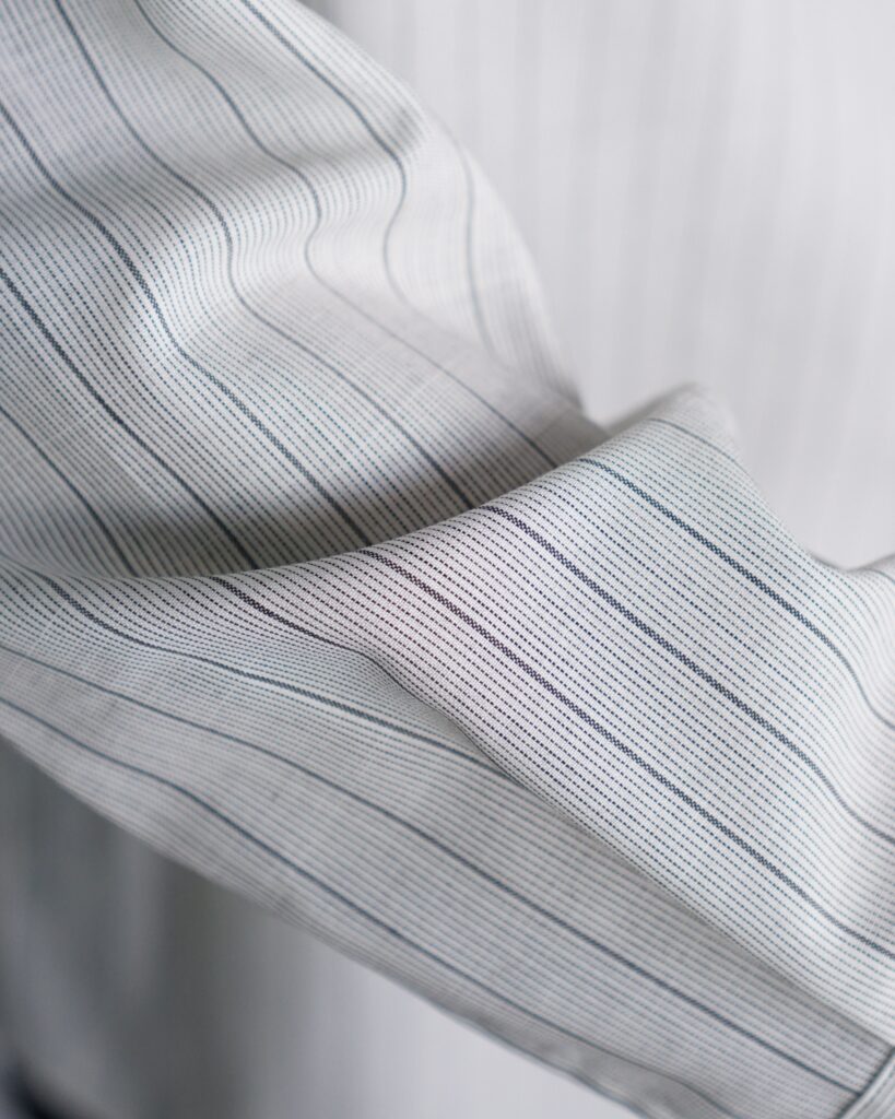 今回はこの素材の美しさを活かし、先染めでストライプ柄を2色ご用意しました。 深みのある墨色の「Ink Trace」、洗いざらしでも美しく、何度洗っても色褪せない、上品な仕上がりです。