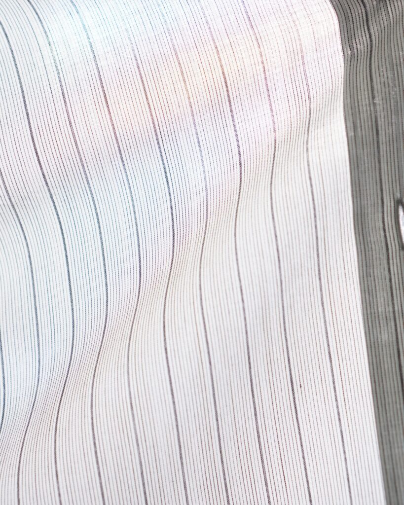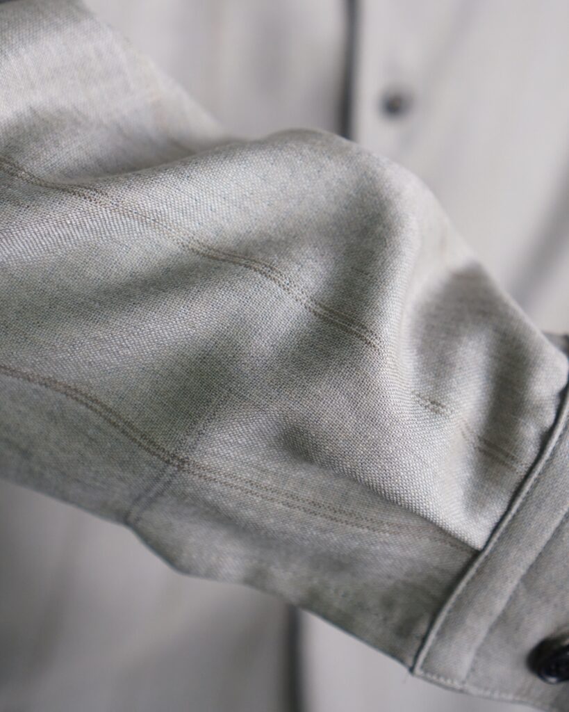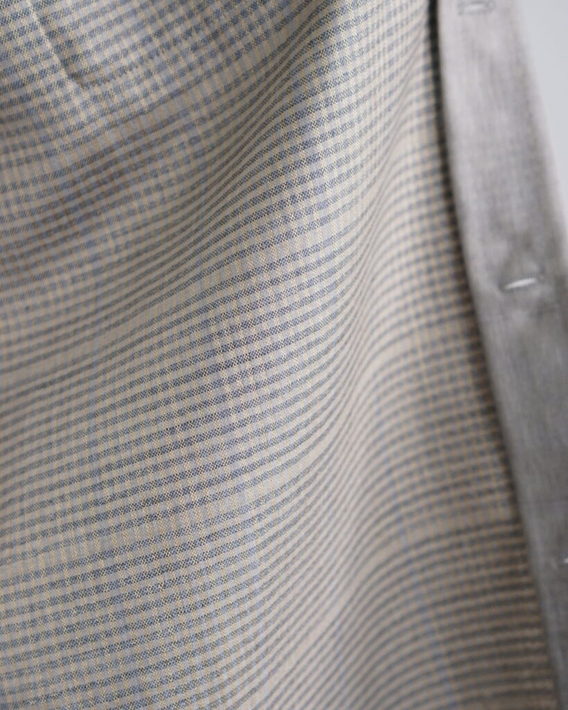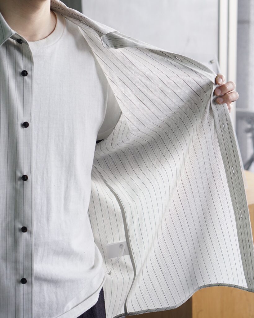肌にまとった時の軽さと清涼感は、まさに「水を纏う」ような感覚。 洗いざらしでも自然で美しく、夏のシャツとして理想的な素材だと自負しています。 ぜひ袖を通して、この新しい水脈を体験していただければと思います。